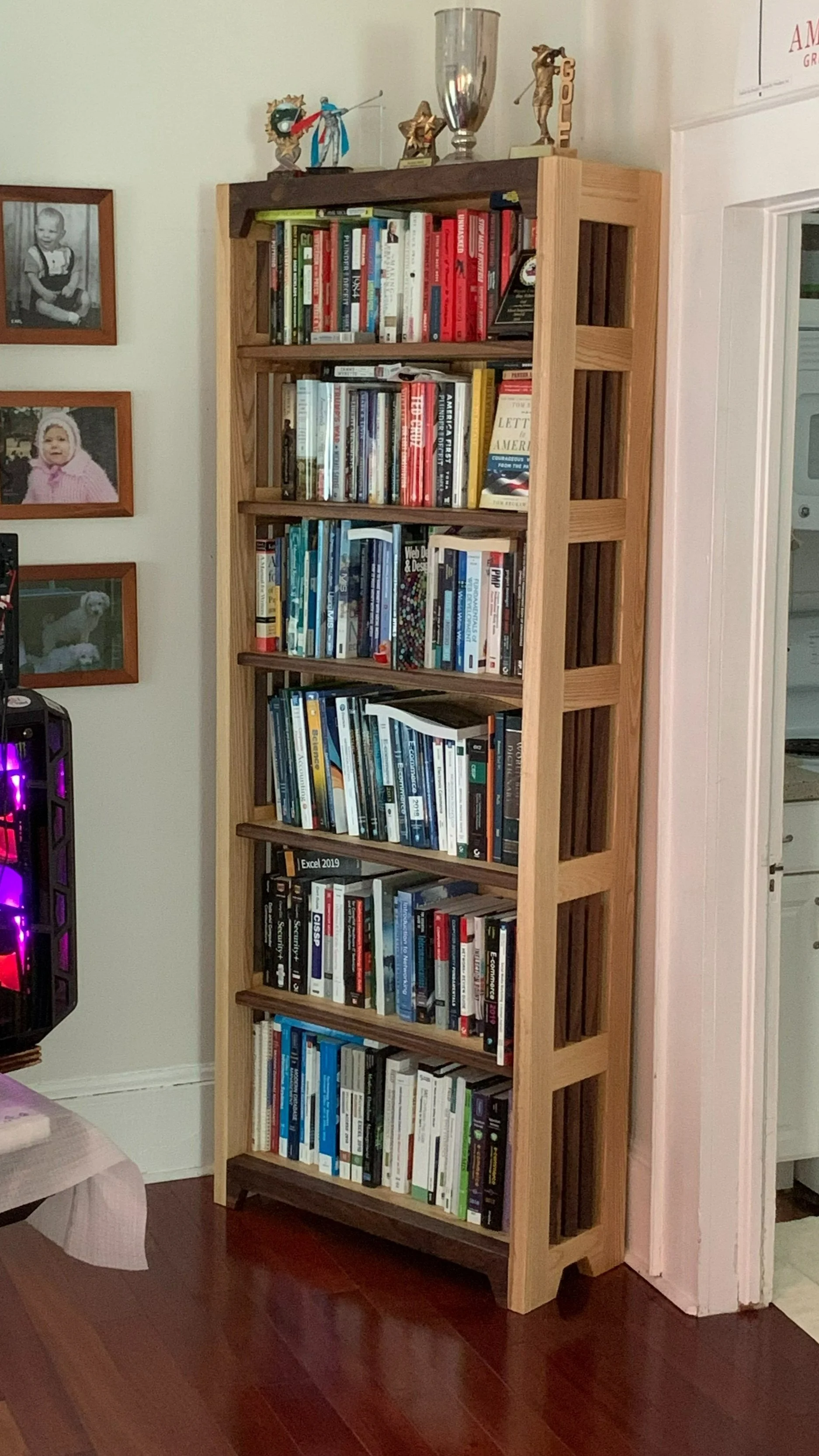 “I have a ton of books, and I had nowhere to organize them! After speaking with Kyle and exchanging multiple ideas, we decided on a mission-style bookcase made from ash with walnut accents. It’s honestly one of my favorite pieces of furniture now. The craftsmanship is next level. It’s made from solid ash, and each of the six shelves is spaced differently to fit all the varying sizes of my books, tall ones, short ones, and everything in between. It really makes the most of the bookcase from top to bottom. Each shelf has a walnut bullnose that adds a nice bit of contrast and character without being too flashy. But the real standout detail is the 36 walnut balusters on the sides. they're set at a 45-degree angle, which gives the whole piece a unique look and some serious personality. Every time I walk by it, I catch myself stopping to admire it. It turned out better than I could have ever imagined.”